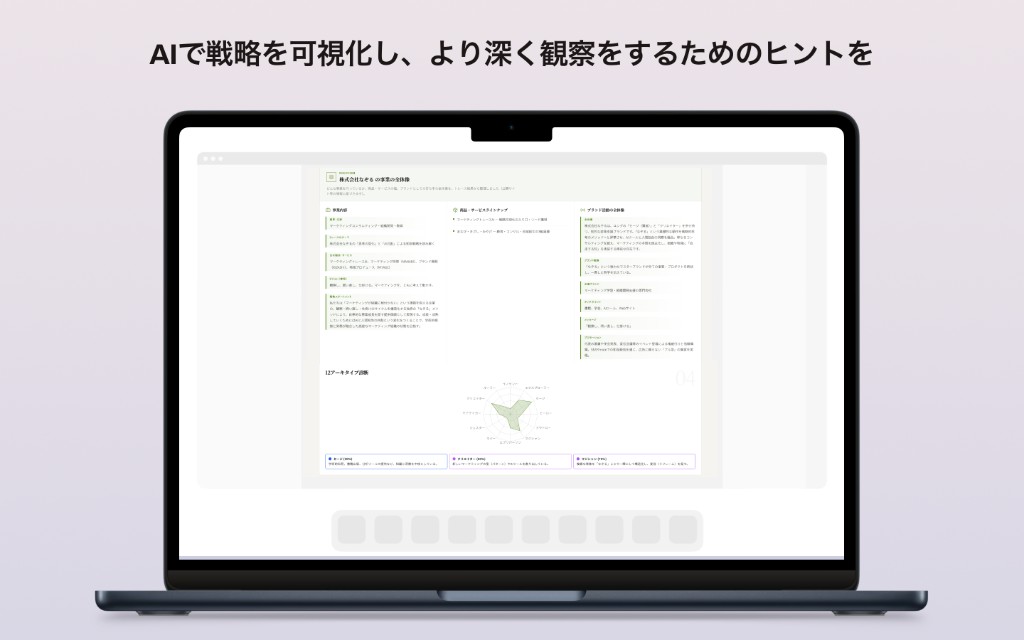 URLを入力するだけで、書籍で解説している「マーケティングトレース」と「ブランディングトレース」の手法をAIが再現。戦略の全体像を可視化し、自社の理解を深めることができます。